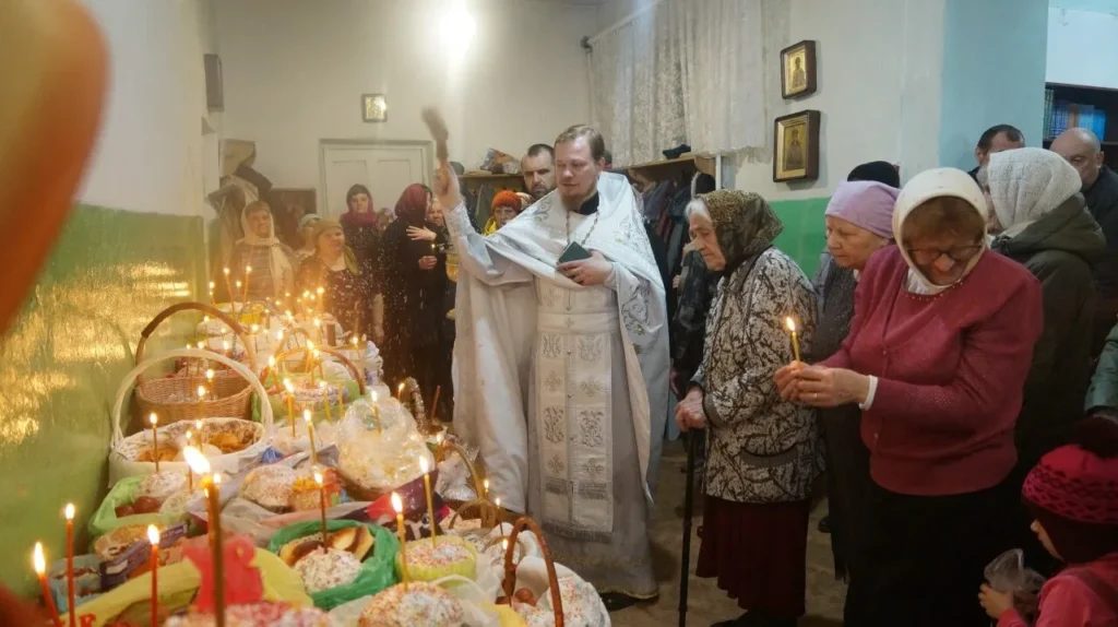 После богослужения, отец Алексей освятил куличи и пр. яства для прихожан.