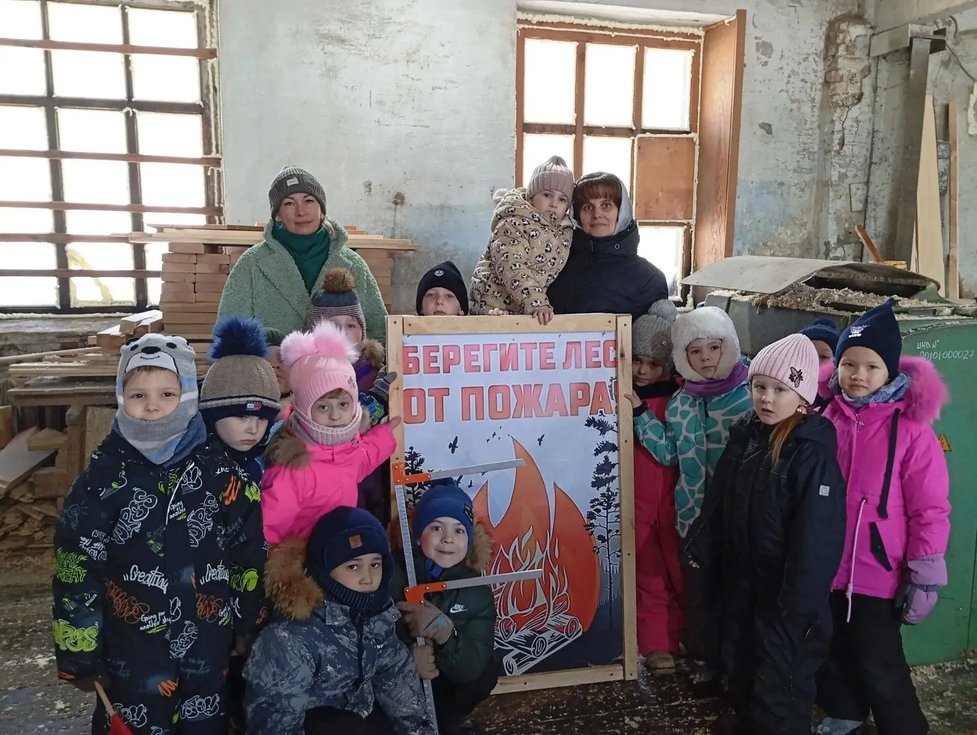 Затем дошкольникам показали деревообрабатывающее производство: цеха по деревообработке, станки — пилораму, лесопильное оборудование, столярную мастерскую.