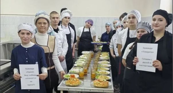 Группа разделилась на 2 команды :»Кухня» и «Поварята». От каждой команды по 5 студентов готовили блюда из одних и тех же продуктов, по одним и тем же технологическим картам: салат «Осень», плов из птицы и компот из кураги. Остальные студенты, как группы поддержки, готовили украшения для блюд из свежих овощей, и для всех участников украшали сладкий приз — пирожное корзиночка.
