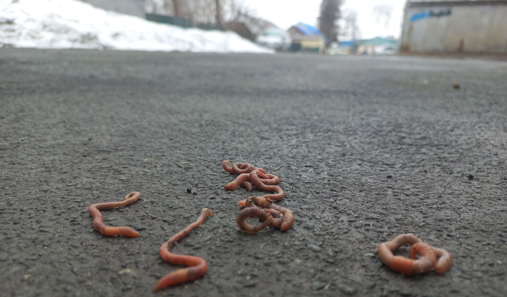 «В субботу, 11 апреля, ночью были заморозки до -7 градусов, вчера днем + 6 градусов, дождь. Ночью около нуля, а сегодня с утра шел снег. При такой погоде все замирает. А тут иду на работу, смотрю по всей асфальтовой дорожке дождевые черви медленно, но ползают. Вышла на парковку автомобилей, там их еще больше», — комментирует жительница Тогучина Наталья Веретарова.