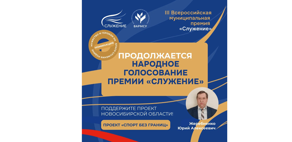 Проект «Спорт без границ» вошел в ТОП-110 лучших на всероссийской муниципальной премии «Служение» и участвует в народном голосовании, в номинации «Мужество и героизм на благо служения Родине».Автор проекта – человек из народа, руководитель Шайдуровского территориального подразделения администрации Сузунского МО Юрий Жеребненко, который помогает людям с ОВЗ.«История Юрия Алексеевича – пример силы духа, преодоления трудностей и настоящего служения обществу», – отметил губернатор Андрей Травников, призывая поддержать номинанта.