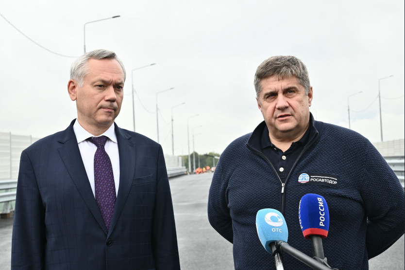 Андрей Травников и руководитель Федерального дорожного агентства Роман Новиков провели выездное совещание на строящейся эстакаде транспортной развязки у въезда в…