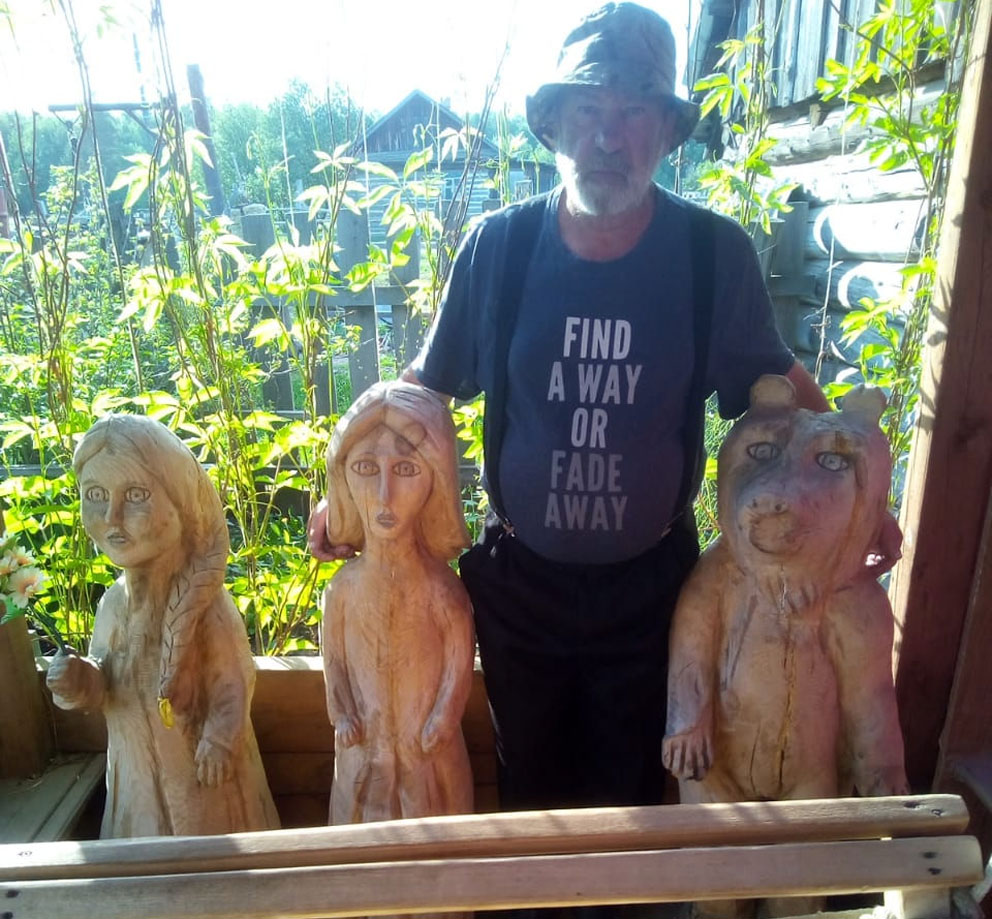 — Когда мне было шесть лет, я увидел в поселке на воротах в доме мастера Поликарпа Михайловича Соловьева – лесовичка. Сказочный персонаж до сих пор перед глазами, — вспоминает Валерий Васильевич. – Несколько часов ходил я вокруг, смотрел не отрываясь, мечтал вырезать такого же себе. И откуда у меня такая тяга взялась к искусству, даже не знаю. Наверное, с этого возраста и возникло, как мне потом объясняли — объемное мышление. В то время у нас почти не было игрушек. Потому и пытался делать деревянные бульдозеры, машины, трактора, вот и играли мы с ними. Нас было пятеро в семье — Виктор, Владимир, Василий, Вениамин и я.