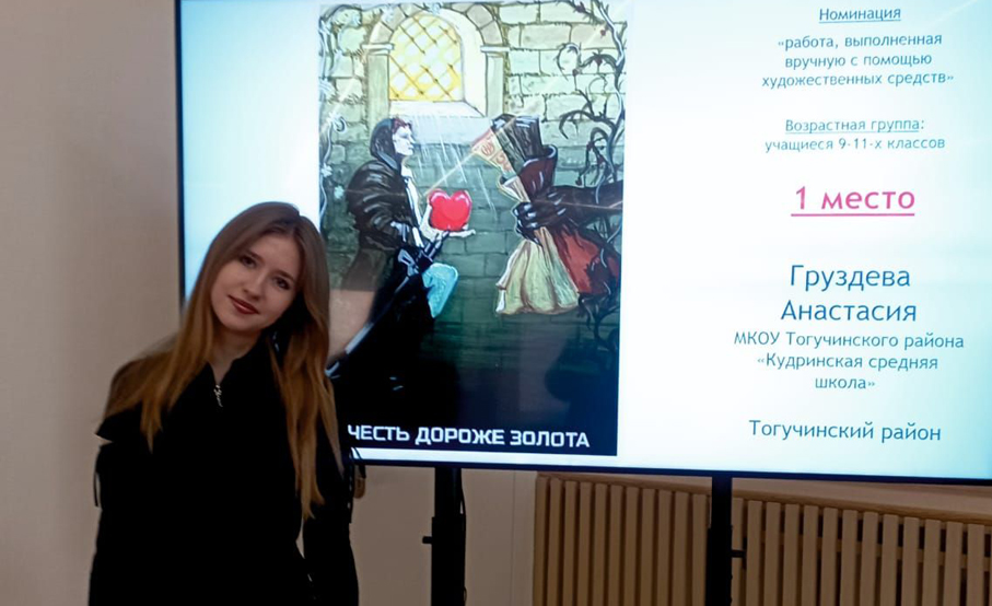 Творческая работа «Честь дороже золота», выполненная учащейся 11 класса Кудринской средней школы Анастасией Груздевой, организаторами конкурса признана лучшей, она получила диплом за первое место.