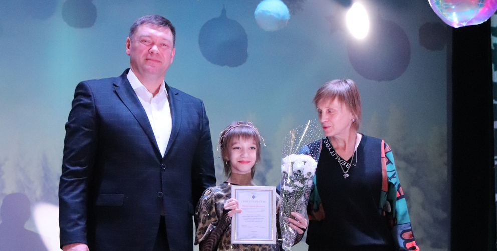 Награду вручил Василине и ее маме Глава Тогучинского района Сергей Пыхтин на открытии главной ёлки района.