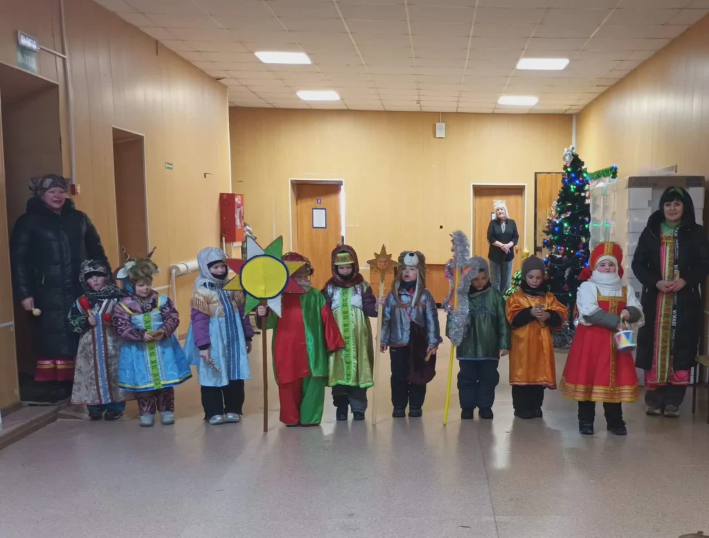 Воспитанники подготовительной группы под руководством воспитателя Митюковой Алёны Ивановны, учителя- логопеда Мерзляковой Натальи Яковлевны и музыкального руководителя Кручининой Натальи Васильевны, нарядились в яркие костюмы ряженых и отправились колядовать. Их путь лежал по близлежащим организациям.